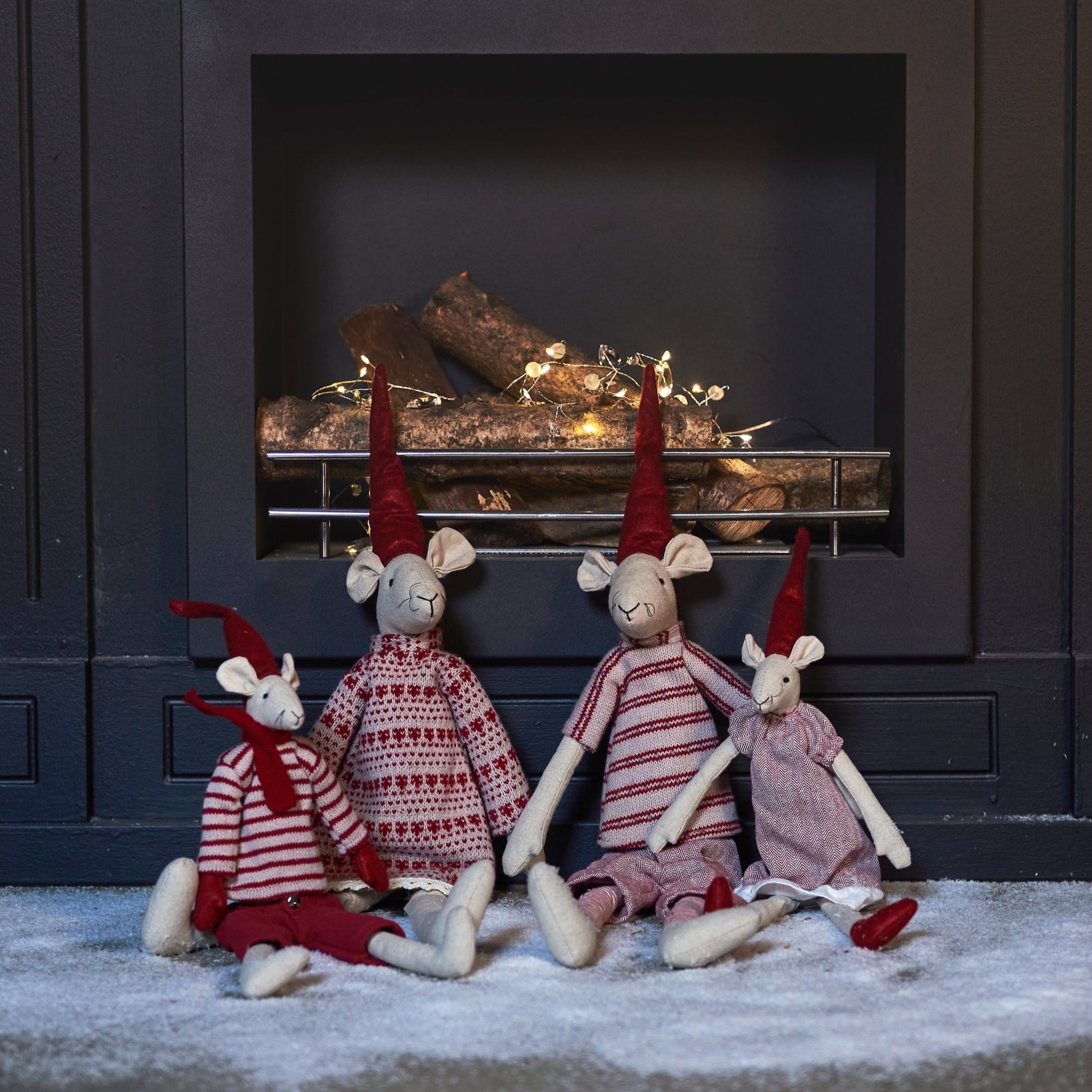 Herre (Noa) og dame (Nelli) stoffmus med juleklær. Disse kan sitte selv.
