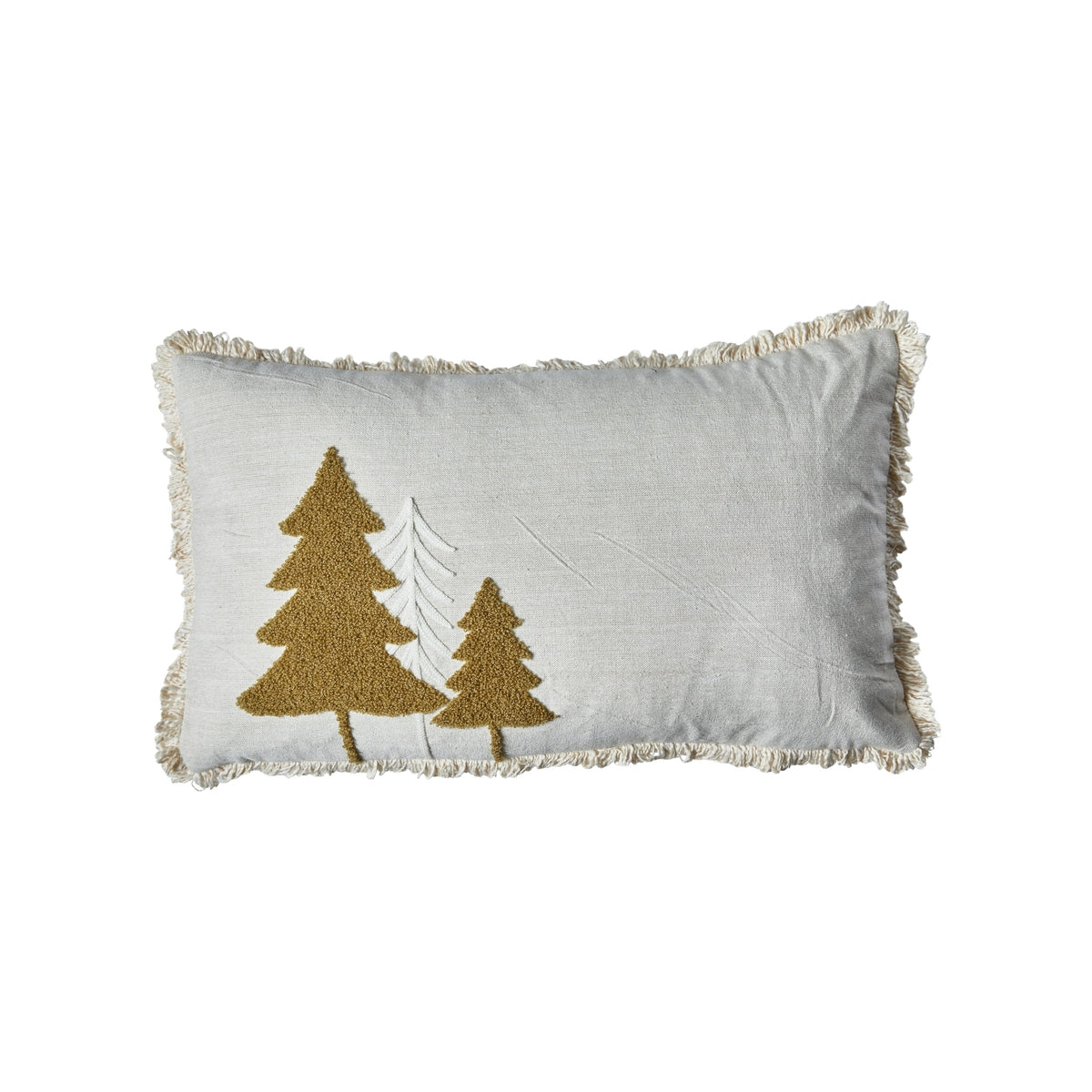 Koselig putetrekk i beige med påsydde trær i hvitt og lys brunt.